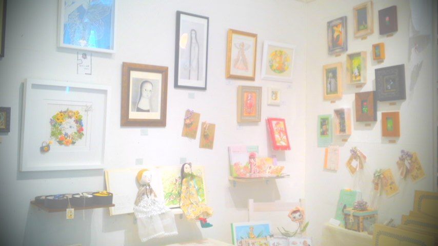 白い壁にさまざまな作家さんの 色とりどりの作品たち