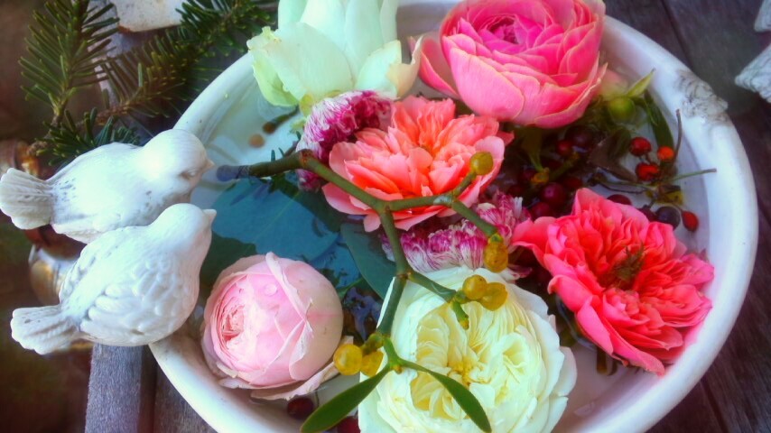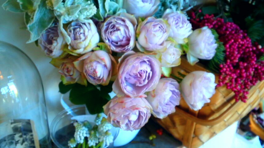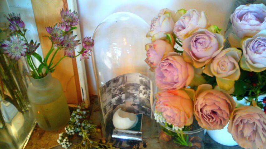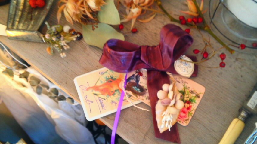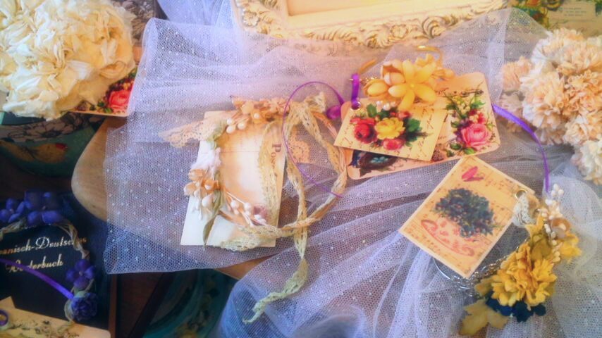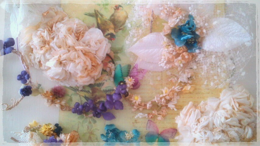 真っ白の布をラベンダーや薔薇、カモミール、藍、紫草、紅花、キャッツクロウなどで染め、
